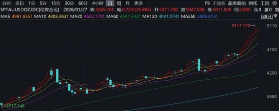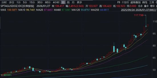 分析称,受政治与财政风险上升推动,投资者转向避险资产。1月26日黄金价格一度大涨2.5%,创下每盎司5100美元以上的历史新高。现货白银日内涨幅一度高达14%,最高触及117美元/盎司。不过国际金银在冲高后大幅跳水,现货白银尾盘转跌,报约102.8美元/盎司。现货黄金向下跌破5000美元/盎司,收涨0.26%。