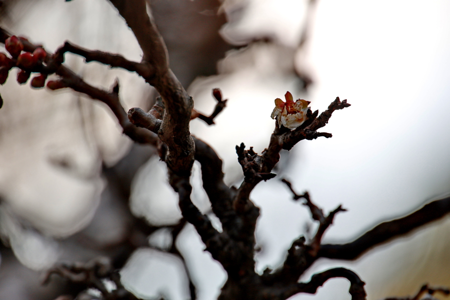 正值小寒次日,在闵行莘庄梅园,素心腊梅已迎着寒风绽放,一株龙游梅赶在新春前吐露芬芳。